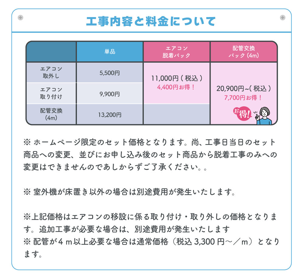 エアコン取外し工事の場合、ガス回収時にリモコンを使用させて頂きますので、予めご準備をお願いします。 エアコン取付の際は、特にお客様にてご準備頂くものはございませんが、室内機の下に脚立を立てられる作業スペースを確保頂けるようお願いします。